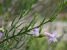 The flowers are borne singly or in groups of up to 3, in leaf axils on a smooth, shiny stalk 6–30 mm (0.2–1 in) long. There are 5 overlapping, egg-shaped to lance-shaped, shiny green sepals which are 3.5–6 mm (0.1–0.2 in) long. The petals are 12–25 mm (0.5–1 in) long and joined at their lower end to form a tube. The petals are a blue, mauve or purple on the outside and white inside the tube. The petal tube and the lobes are shiny and glabrous but the inside of the tube is filled with long, soft hairs. The 4 stamens are fully enclosed in the petal tube. Flowering occurs in many months of the year but mostly in August and September. The fruits which follow are oval to oblong in shape, glabrous, shiny and sticky and 4.5–7.5 mm (0.2–0.3 in) long.[2][3]