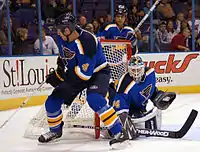 In August 2005, following the lockout, the Oilers traded Brewer, Jeff Woywitka and Doug Lynch to the St. Louis Blues in exchange for defenceman Chris Pronger.[50] At the time of the trade, Brewer was a restricted free agent, so on August 15, 2005, Brewer accepted the Blues' qualifying offer, signing a one-year, $2-million contract.[51] Brewer's first season with the Blues was a particularly poor one. After playing the first 18 games of the season, Brewer separated his shoulder on November 16, 2005, in a 2–0 victory over the Columbus Blue Jackets.[52] Brewer missed ten games before being activated from the injured reserve list, returning to the St. Louis line-up for a game on December 17, 2005, against the Philadelphia Flyers.[53][54] Less than a month later, in a game on January 13, 2006, against the Atlanta Thrashers, Brewer collided with the Thrashers' centre Karl Stewart, and dislocated his left shoulder, which ended his season.[55] In just 32 games, Brewer finished his season with nine points, including six goals, two shy of his career best of eight set in the 2002–04 season. Despite his limited play, the Blues re-signed Brewer to a one-year, $2.014 million contract for the 2006–07 season.[56][57]