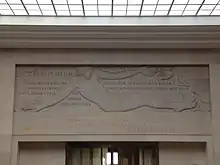 Along with his Guild work and illustrations, Gill designed several war memorials in this period. These included the Trumpington War Memorial in Cambridgeshire, the Chirk War Memorial in north Wales, the memorial at Ditchling, and the wall panel recording 228 names of the fallen in the ante-chapel at New College, Oxford.[1][18][19][20] Gill also created the memorial at Briantspuddle in Dorset and, with Chute and Hilary Stratton, the monument at South Harting.[21][22] Beside the main entrance to the British Museum, Gill designed and carved, with Joseph Cribb, the memorial inscription to the museum staff killed in the conflict and for the Victoria and Albert Museum, again with Cribb, he created the war memorial in that museum's entrance hall.[23][24] Previously, in 1911, Gill had cut the inscription for the foundation stone of the British Museum's new King Edward VII building.[5] Gill's other significant work from this period was the Stations of the Cross that he carved, with Chute, for the Church of St Cuthbert in the Manningham area of Bradford.[25]