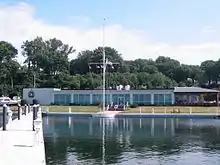 But finally, buildings were finished, moorings installed, docks and piers constructed, grounds graded, drained, and seeded, driveway parking spaces paved and walks laid out. The marine railway was constructed, tennis courts built, a club spar erected, and later a locker house [still extant] built upon a flooring laid down as a temporary dancing pavilion. Lights, signs, screens and a hundred other refining details followed in their place, and the club was finally in shape barely in time for the formal opening on August 22, 1919.