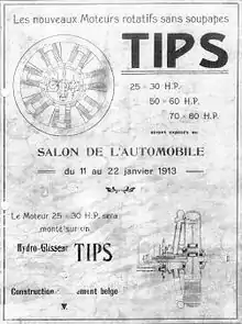 E.O. Tips was already building aircraft ("avion Canard") in 1908, with his brother Maurice. In 1909, they had built a biplane with a rotor. Together, they acquired the licence of the Gnome engine for Belgium and the Netherlands.[2][1]