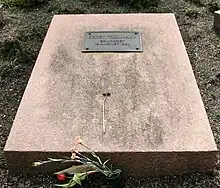 Thälmann spent over eleven years in solitary confinement. In August 1944, he was transferred from Bautzen prison to Buchenwald concentration camp. That same August, Heinrich Himmler notes down for the Führer that "Thälmann must be executed."[22] A fellow Buchenwald prisoner, Marian Zgoda, recalls hearing the shooting of Thälmann on the 18th—four days after Himmler's curt suggestion.[23] After he was shot under Hitler's personal order,[24][22] his body was immediately cremated.[5] Shortly after, the Nazis claimed in an announcement that, together with Rudolf Breitscheid, Thälmann had died in an Allied bombing attack on 23 August.[25]