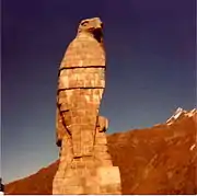 Officers of the mountain brigade considered to erect a cenotaph for the golden eagle, the symbol of the brigade, from stone tailings of the fortification Gondo. Baumann had good connections to the commanders of the brigade. Brigadier Hans Bühler was married to his second cousin, and he knew the colonel of the engineer corps, Werner Grimm, since his youth in Berne. Baumann got the job to explore the possibilities and his proposal of an over nine meter high monument made of the tailings pleased the two superiors. Baumann described his approach in the following way:[7]