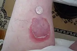 Erythema annulare centrifugum (EAC), is a descriptive term for a class of skin lesion[2] presenting redness (erythema) in a ring form (anulare) that spreads from a center (centrifugum). It was first described by Darier in 1916.[3][4][5] Many different terms have been used to classify these types of lesions and it is still controversial on what exactly defines EAC. Some of the types include annular erythema (deep and superficial), erythema perstans, erythema gyratum perstans, erythema gyratum repens, darier erythema (deep gyrate erythema) and erythema figuratum perstans.