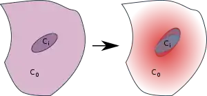 An inclusion in a linear elastic body. The stiffness tensor of the body is C0 and that of the inclusion is Ci. When the body and the inclusion have different elastic properties the inclusion is called an inhomogeneity. A transformation strain changes the shape and size of the inclusion.