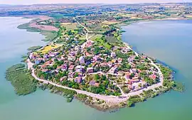 The village is located on a very small peninsula, inshore of Lake Uluabat. The local community is composed of people who immigrated from Drama, Greece in 1924 as a result of population exchange between Greece and Turkey, and people who immigrated from Bulgaria in 1937.[3]