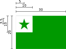By recommendation of the board of the Universal Esperanto Association, the flag should have the following proportions: The ratio of the width of the flag to the height of the flag to a side of the white square should be 3 to 2 to 1. The ratio of a side of the white square to the radius of a circle enclosing the star should be 10 to 3.5.