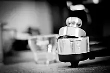 A portafilter (or group handle) attaches to the grouphead of semi-automatic and piston-driven espresso machines, and carries a tamped puck of coffee grounds within its basket. It is usually made of brass for better heat retention, and is attached by a plastic or wooden handle. The portafilter forms a seal with the espresso machine's gasket, and directs high-pressure hot water through the coffee puck. After-market retailers also sell bottomless portafilters that minimize the espresso's contact with any metal. A bottomless portafilter is one tool baristas use to analyze the quality of the coffee grind and the evenness of the extraction and allows for a visual check of "channeling" or the condition in which water is able to pierce a hole in the espresso puck during the brew process leading to poor extraction. Often, baristas use knockboxes to store their spent espresso grounds after they have pulled a shot.