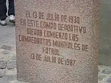 Due to various factors, it is considered a historical stadium.[6][7][8] Built in 1900, it is the oldest current stadium in America and the fifteenth in the world.[9][10] But it mainly stands out for having hosted the 1930 FIFA World Cup, playing one of the first two matches in the history of the competition, when on 13 July 1930 United States defeated Belgium 3–0 in Group D. FIFA remembered this fact when in 2005 a delegation headed by its president, Joseph Blatter,[11] came to visit the reforms and placed a commemorative plaque at the stadium. This historical fact was remembered by FIFA on two occasions: 1987 and 2005.[12]