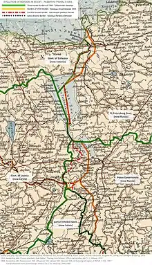 According to the Treaty of Brest-Litovsk (1918) between Soviet Russia and German Empire, which controlled all of the Estonian territory by that time, Russia relinquished its claims to Estonia and determined that the border between the Grand Duchy of Livonia and Russia should have followed the Narva river.[17] In late 1918 a war broke out between Soviet Russia and Estonia supported by the White Russian Northwestern Army and the British Navy. By February 1919 Estonians repelled the Red Army back to Russia and in April 1919 the Bolshevik government initiated peace talks with Estonia.[16] The British government, however, pressed to continue the war and in May and October 1919 Estonian and White Russian troops attempted two major offensives towards Petrograd. As both of them failed, peace talks continued and the issue of the border was brought up on 8 December 1919. The Estonian party proposed Russian counterpart to cede about 10,000 km2 (3,900 sq mi) from the Petrograd and Pskov Governorates to the east of the pre-war borders. The next day the Russians reacted likewise, offering Estonia to cede its northeastern part. In December 1919 it was agreed that the boundary line would go along the actual frontline between the belligerents.