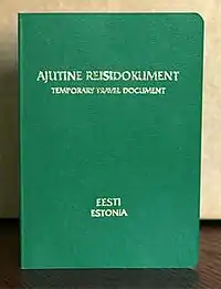 An Estonian temporary travel document (Ajutine Reisidokument) is a travel document issued to an alien staying in Estonia for departure from and return to Estonia. A temporary travel document may be issued, without a standard application, to an alien who departs or is obliged to depart from Estonia without the right of return if he or she does not hold a valid travel document or a certificate of return issued by a foreign state. A temporary travel document for a single departure from and return to Estonia may be issued to an alien legally residing in Estonia if he or she does not hold a valid travel document and does not have the right to receive an alien’s passport. A temporary travel document does not grant the holder thereof the right to protection by a foreign mission of Estonia unless otherwise provided by law or a treaty.[2] A temporary travel document shall be issued with a period of validity of up to two years.[3]