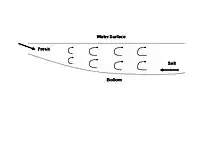 These estuaries are characterized by a sharp density interface between the upper layer of freshwater and the bottom layer of saline water. River water dominates in this system, and tidal effects have a small role in the circulation patterns. The freshwater floats on top of the seawater and gradually thins as it moves seaward. The denser seawater moves along the bottom up the estuary forming a wedge shaped layer and becoming thinner as it moves landward. As a velocity difference develops between the two layers, shear forces generate internal waves at the interface, mixing the seawater upward with the freshwater.[6] An example is the Mississippi estuary.