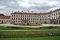 The first architect to work on the project was Johann Ferdinand Mödlhammer, succeeded in 1765 by Melchior Hefele.[1] While the palace is often compared to Versailles, which the Prince had visited in 1764 when he visited Paris,[2][3] H. C. Robbins Landon claims that a more direct influence can be found in "Austrian prototypes, particularly Schönbrunn palace in Vienna." Three of the windows above the main entrance are designed as homage to strings instruments, violin, viola, cello.
