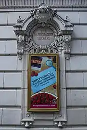 On either side of the doors are terracotta niches with bronze-framed sign boards. Above the signboards are terracotta wreaths, which surround circular panels with the gilded letters "The Barrymore Theater". Each wreath is topped by a curved pediment. The western and eastern portions of the facade are recessed slightly and contain recessed openings.[15] The opening to the east is marked as the stage door.[10][15] A frieze, decorated with leaf and wave moldings, runs above the first floor.[15] To the east, there was originally a stage house with fire escapes on its facade, but this has since been replaced with the Morgan Stanley Building.[17]