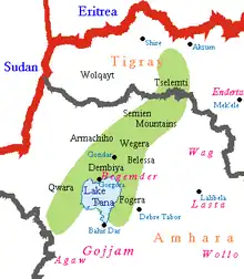 In 1329, Emperor Amda Seyon campaigned in the northwest provinces of Semien, Wegera, Tselemt, Tsegede and Dembiya in which many had been converting to Judaism and where the Beta Israel had been gaining prominence.[3] He sent troops there to fight people "like Jews" (Ge'ez ከመ:አይሁድ kama ayhūd).[4] There is no evidence for a unified Beta Israel dominion at this time. Judaized groups were dispersed, politically divided,- some being allied to the Emperor.[5][6]