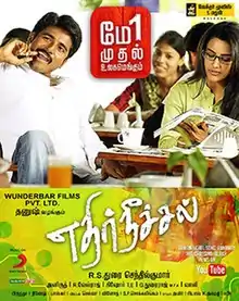 Ethir Neechal (transl. Swimming against the tide) is a 2013 Indian Tamil-language coming-of-age comedy drama film written and directed by R. S. Durai Senthilkumar in his directorial debut. The film stars Sivakarthikeyan, Priya Anand and Nandita Swetha. Produced by Dhanush under his studio Wunderbar Films, it was distributed by S. Madhan under the banner Vendhar Movies.[2] Principal photography commenced on 23 July 2012, and was ended on 22 February 2013. The music for the film is composed by Anirudh Ravichander, with cinematography performed by Velraj and editing by Kishore Te. The film was released on 1 May 2013 to generally positive reviews and became a blockbuster.