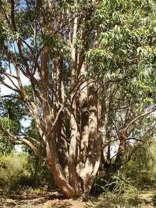 Eucalyptus cloeziana, commonly known as Gympie messmate or dead finish,[3] is a species of tree that is endemic to Queensland. It has rough, flaky to fibrous bark on its trunk, smooth bark above, lance-shaped to curved adult leaves that are much paler on the lower side, flower buds in groups of seven, white flowers and hemispherical fruit.