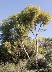 Saplings, young trees and coppice regrowth have rough and fibrous yellow-brown bark[16] on the stems that become smoother as trees mature. The stems of saplings can be circular or square shaped in cross section and have a powdery coating (glaucous).[14] Older trees have smooth powdery or non-powdery white bark,[9] often with patches of white, grey or light brown[17][14] giving the trunk a mottled appearance.[1] Old layers of darker coloured bark are scattered and loosely held and are shed in flakes; it is not uncommon for a few flakes to persist on the trunk for a long time.[18]: 30 The bark is shed in irregular slabs.[18]: 16 Branchlets do not have a powdery coating as the bark of older trees can. The soft central cylinder of tissue within, the pith, contains many glands.[14]