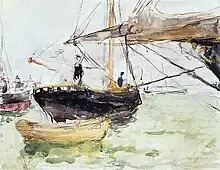 Other paintings from this trip focus on the boats in the harbor. Boats on the Quay, 1875 is a painting of a single docked boat from a similar vantage point, also showing people walking along the shore. Boats - Entry to the Medina in the Isle of Wight, 1875 and Aboard a Yacht, 1875 are the last two paintings from this location.[6] Both of these pieces depict a more close up image of boats on the sea; here we have fully lost the shoreline in the foreground and the wide scale of many other boats in the port.