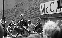 The month of March kicked off with charges from the media that McCarthy's campaign was just dragging along. Cited was his tardiness to the Senate floor, which failed to prevent a Southern filibuster against a civil rights bill drafted by fellow Minnesota Senator Walter Mondale.[25] Despite the setback, three precincts in Minnesota elected McCarthy supported delegates to caucuses, to the detriment of Vice-President Hubert Humphrey, and President Johnson decided to abandon Massachusetts, giving 72 delegates to McCarthy. He described the news as "encouraging".[26] At this point, McCarthy had spent a large amount of time campaigning in New Hampshire, hoping to improve his standing before the state's critical primary. Meanwhile, President Johnson's campaign circulated the slogan that "the communists in Vietnam are watching the New Hampshire primary ... don't vote for fuzzy thinking and surrender."[27] McCarthy likened this statement to McCarthyism, a reference to Senator Joe McCarthy of Wisconsin.[27] Opinion polls prior to the New Hampshire primary showed that McCarthy's support stood at only 10 to 20 percent. Although he did not win the contest, he stunned spectators of the race by winning a surprising 42.2 percent of the vote to Johnson's 49.4 percent.[28] Media outlets described the results as a "moral victory" for McCarthy,[29] and influenced Robert Kennedy's decision to enter the race on March 16.[30] Kennedy's announcement did not affect McCarthy's campaign. He remained committed to the "young people"[31] who had supported his campaign all along, and remarked that he was "better qualified to run for the presidency" than Kennedy.[31] McCarthy set his sights on Wisconsin and began to prepare for the state's April primary. He ran advertisements in newspapers throughout the state and included his platform. In it, he called for "more federal aid for education",[32] collective bargaining rights for farmers, "a guaranteed minimum livable income for all Americans", the construction of "at least one million new housing units each year, and more "federal funds to stop pollution".[32] While in Wisconsin, he criticized the government of South Vietnam, saying that it would be "too kind"[33] to label the entity as corrupt and a dictatorship. He then announced his intentions to enter the primaries in Indiana and Florida, and hoped to compete in California in the upcoming months.[33] On March 31, President Johnson made the surprise announcement that he was dropping out of the race and would not seek to be renominated for the presidency.[34]
