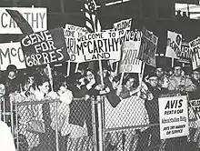 McCarthy began January by making no promises about a potential challenge of the president on the Florida primary ballot, but reaffirmed his goal to defeat the president in New Hampshire.[9] The next day, he appeared as the first guest of the half-hour ABC news series Issues and Answers, and discussed his views on pertinent campaign issues.[10] He claimed the North Vietnamese government was willing to negotiate, and that any further bombing should be halted to forge an end to the hostilities.[11] As President Johnson prepared for his annual State of the Union Address, McCarthy requested equal time from television networks after the president discussed the McCarthy-Kennedy conspiracy theory the previous month. The request was rejected.[12] Later in the month, McCarthy delivered a speech in front of 6,500 students at University Park, Pennsylvania, that criticized the Johnson administration for being "afraid to negotiate"[13] with the North Vietnamese.[13] This came as Robert Kennedy commented that he would support Johnson as the nominee, even though his views more closely resembled McCarthy's, predicting that the campaign would have a "healthy influence"[14] on Johnson, whom he picked to ultimately win the nomination.[14] Near the end of January, McCarthy campaigned in St. Louis, where he continued his anti-war rhetoric, describing the Vietnam War as against "American tradition"[15] and declared that "no nation has a right"[15] to "destroy a nation"[15] with the rationale of "nation building".[15] He then discussed his support for normalized relations with Cuba.[15] After seven weeks of campaigning, McCarthy concluded that his speeches were coming across more as poetry than substantive campaign messages. As he traveled through California, a stop in Stanford was greeted by newspaper headlines that asked the candidate whether he "want[ed] to make righteous speeches ... or end the Viet Nam War."[16] As his candidacy continued, McCarthy and his staffers worked to improve the campaign's "passion gap".[16]