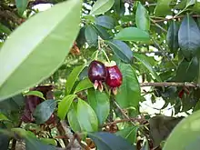 Eugenia involucrata, the Cherry of the Rio Grande, is an evergreen shrub native to Brazil which bears small fruits that are dark red to purple in color and have a sweet cherry-like flavor. They are hardy to 20F when mature, though younger plants should be protected from frosts. [3]