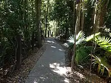A total of 16 species of fungi, 19 mosses, 4 conifers, 92 ferns, 299 dicots and 54 monocots are recorded as occurring in the National Park.[10] Much of the rainforest in the National Park is complex mesophyll vine forest with pockets of simple and complex notophyll vine forests on poorer soils.[3] Many of the vegetation communities including rainforests, vine thickets and vine forests are considered fire sensitive.[11]