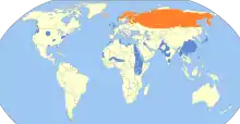 It breeds in the northernmost areas of Europe and the Palearctic.[8] It is the Old World counterpart of North America's American wigeon. It is strongly migratory and winters further south than its breeding range. It migrates to southern Asia and Africa.[8] In Great Britain and Ireland, the Eurasian wigeon is common as a winter visitor, but scarce as a breeding bird in Scotland, the Lake District, the Pennines and occasionally further south, with only a handful of breeding pairs in Ireland. It can be found as an uncommon winter visitor in the United States on the mid-Atlantic and Pacific coasts. It is a rare visitor to the rest of the United States except for the Four Corners and the southern Appalachians.[5][7]