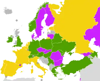 38 nations of Europe have competed since the initial 1998 season. Only four have featured in every season[lower-alpha 1]France, Italy, Portugal and Spain. The most successful nation is Portugal with eight titles,[1] followed by Spain and Russia with five titles each.[7] Italy have three titles (and are also current champions), Switzerland have two titles, whilst Germany, France and Ukraine have one title each.