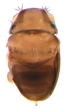 They are believed to lay their eggs in the heads of small Crematogaster ants. The larva consumes the interior of the ant's head, within whose exoskeleton it pupates, before emerging as an adult.[2][3]