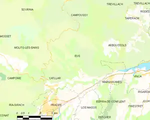 Eus is located in the canton of Les Pyrénées catalanes and in the arrondissement of Prades.