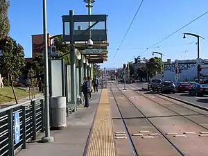 Evans station is a light rail station on the Muni Metro T Third Street line, located in the median of 3rd Street at Evans Avenue in the Bayview neighborhood of San Francisco, California. The station opened with the T Third Street line on January 13, 2007. It has two side platforms; the northbound platform is north of Evans Avenue, and the southbound platform south of Evans Avenue so that trains can pass through the intersection before the station stop.