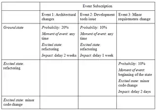 Another tool that can be used to simplify the definition of events is a state table. Columns in the state table represent events; rows represent the states of an activity. Information for each event in each state includes four properties of event subscription: probability, moment of event, excited state, and impact of the event. State tables help to depict an activity’s subscription to the events: if a cell is empty the state is not subscribed to the event.
