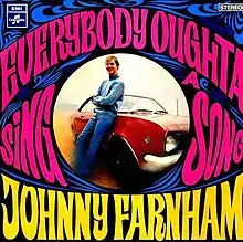 Everybody Oughta Sing A Song is the second solo studio album by Australian pop singer John Farnham (billed then as Johnny Farnham) and was released on EMI Records in November 1968.[1][2][3] Its first single, released in July, was the double A-sided, "Jamie"/"I Don't Want To Love You", which peaked at No. 8 on the Go-Set National Singles Charts.[1][4] The second single, "Rose Coloured Glasses" was released in October and peaked at No. 16.[1][5] Writers on the album included Hans Poulsen, Neil Diamond and Quincy Jones. The album was re-released in 1974 with a different cover, it shows Farnham performing live on stage, whereas the initial 1968 release had him leaning against a Holden Monaro (see infobox at right).