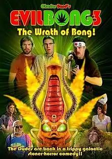 Evil Bong 3-D: The Wrath of Bong is a 2011 comedy film directed by Charles Band and the third film in the Evil Bong series, following Evil Bong 2: King Bong.[1] The film was released on April 8, 2011 through Full Moon Entertainment and was given a limited theatrical release which featured a live stage show from the band in a tour format,[2] making it the first Full Moon film to be released theatrically. Evil Bong was shot in 3D and utilized scratch and sniff cards that film viewers could smell at certain times during the film.[3][4]