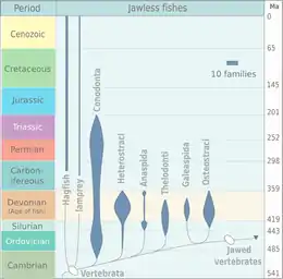 The first ancestors of fish, or animals that were probably closely related to fish, were Haikouichthys and Myllokunmingia.[7][4] These three genera all appeared around 530 Ma. Unlike the other fauna that dominated the Cambrian, these groups had the basic vertebrate body plan: a notochord, rudimentary vertebrae, and a well-defined head and tail.[8] All of these early vertebrates lacked jaws in the common sense and relied on filter feeding close to the seabed.[9]