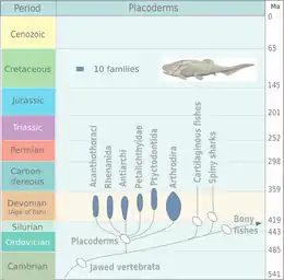 Placoderms, class Placodermi (plate skinned), are extinct armoured prehistoric fish, which appeared about 430 Ma in the Early to Middle Silurian. They were mostly wiped out during the Late Devonian Extinction event, 378 Ma, though some survived and made a slight recovery in diversity during the Famennian epoch before dying out entirely at the close of the Devonian, 360 mya; they are ultimately ancestral to modern gnathostome vertebrates.[31][32] Their head and thorax were covered with massive and often ornamented armoured plates. The rest of the body was scaled or naked, depending on the species. The armour shield was articulated, with the head armour hinged to the thoracic armour. This allowed placoderms to lift their heads, unlike ostracoderms. Placoderms were the first jawed fish; their jaws likely evolved from the first of their gill arches. The chart on the right shows the rise and demise of the separate placoderm lineages: Acanthothoraci, Rhenanida, Antiarchi, Petalichthyidae, Ptyctodontida and Arthrodira.