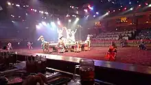 Tournament of Kings incorporates pyrotechnics and various stunt work, including sword fights.[64][70] As of 2008, the cast included up to 38 humans and 11 horses. The show had a total of 30 horses, kept in an air-conditioned facility behind the resort.[71] As of 2010, it was the only show in Las Vegas to feature horses.[72] King Arthur's Tournament had featured female horse riders, although it would not be until 2014 that Tournament of Kings introduced its first female rider.[73][74][75]