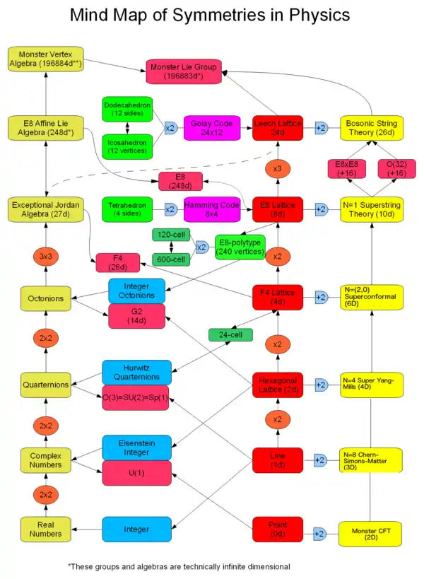 • The exceptional Lie groups can be seen as symmetries of the octonions and structures derived from the octonions;[19] further, the E8 algebra is related to the E8 lattice, as the notation implies (the lattice is generated by the root system of the algebra).