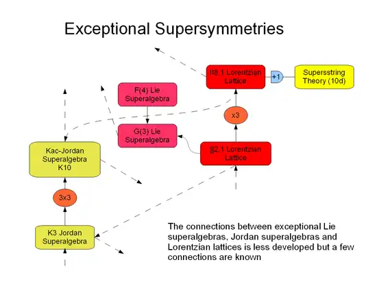 There are a few exceptional objects with supersymmetry. The classification of superalgebras by Kac and Tierry-Mieg indicates that the Lie superalgebras G(3) in 31 dimensions and F(4) in 40 dimensions, and the Jordan superalgebras K3 and K10, are examples of exceptional objects.[8][9]