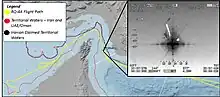 The Iranian account of the drone's location at the time of the shoot-down is contested by the United States. The commander of United States Air Forces Central Command, Air Force Lieutenant General Joseph Guastella, said the "closest that the drone got to the Iranian coast was 21 miles."[17] Later, U.S. Central Command issued a map of the RQ-4A's flight path, showing the attack position as several miles outside Iran's territorial waters. They also released an infra-red image of an apparent explosion destroying the RQ-4A taken from another aircraft at 25°57′27″N 56°52′39″E / 25.95750°N 56.87750°E, 17.3 nautical miles (32.0 km) off Iran's coast.[21][22] The New York Times, citing a senior official in the Trump administration, reported that there were some doubts inside the administration about whether the drone and a Boeing P-8 Poseidon manned aircraft had indeed avoided Iranian airspace throughout their entire flights.[23] Brig. Gen. Amir Ali Hajizadeh, commander of Aerospace Force of the Islamic Revolutionary Guard Corps, said that the U.S. was warned twice about the infringement of Iran's territorial limit and stated, "When it did not redirect its route and continued flying toward and into our territory, we had to shoot it at 4:05 a.m. Our national security is a red line."[24] Hajizadeh also talked about the manned American P-8 plane over Iran's territory, saying "With the U.S. drone in the region there was also an American P-8 plane with 35 people on board. This plane also entered our airspace and we could have shot it down, but we did not."[25]