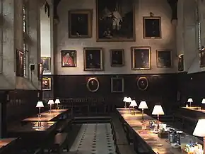 The Front Quadrangle sits on roughly the site of the medieval college, although of the earliest buildings, only Palmer's Tower in the north-eastern corner remains.[10] Constructed in 1432, the tower, which was once the primary entrance to the college, now houses various offices and lodgings for fellows, and at its base is a memorial to members who were killed in the Second World War. The quadrangle is dominated by the chapel, designed by Sir George Gilbert Scott and constructed in 1854–1860,[10] which was heavily inspired by the Sainte-Chapelle in Paris. On the opposite side stands the hall, constructed in 1618,[10] notable for its vaulted ceilings and numerous fine portraits, underneath which is the college bar. Building work over the following century resulted in the quadrangle taking on its current appearance in 1710. The Front Quadrangle also houses the Junior, Middle and Senior Common Rooms, as well as lodgings for fellows and undergraduates.
