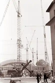 The center was designed by architects Ilija Arnautović, Milan Mihelič, Branko Simčič, and Marko Šlajmer in the 1950s and the 1960s,.[1] In 1954 the Communist Party of Yugoslavia decided that its 1955 7th Congress would take place in the new exhibition centre, and the construction was sped up accordingly.[2] To make room for the new exhibition center, many of the old structures were destroyed. It was built on top of the former Saint Christopher's Cemetery and two churches were removed for the construction: the old Saint Christopher's Church (a Baroque structure) and Saints Cyril and Methodius Church (designed by Jože Plečnik).[2][3]
