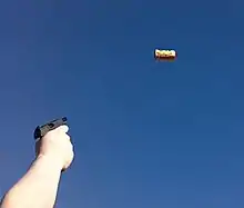 Exhibition shooting or trick shooting is a sport in which a marksman performs various feats of skill, frequently using non-traditional targets. Exhibition shooting tends to stress both speed and accuracy, often with elements of danger added.