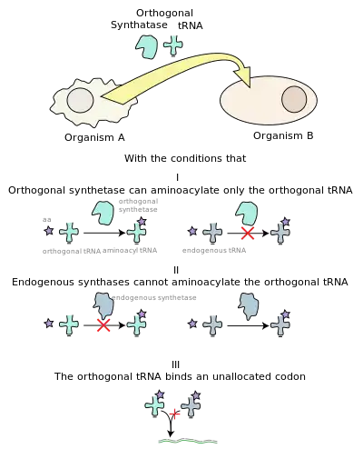 - ↑ Nehring S, Budisa N, Wiltschi B (2012). "Performance analysis of orthogonal pairs designed for an expanded eukaryotic genetic code". PLOS ONE. 7 (4): e31992. Bibcode:2012PLoSO...731992N. doi:10.1371/journal.pone.0031992. PMC 3320878. PMID 22493661.