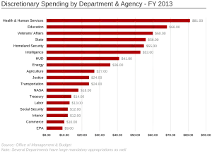 The Federal government spent approximately $600 billion during 2016 on the Cabinet departments and Agencies, excluding the Department of Defense, representing 16% of budgeted expenditures[5] or about 3.3% of GDP. The 2011 budget included estimated spending for 2010, shown in the graph at right for selected departments and agencies with over $10 billion in budget authority.