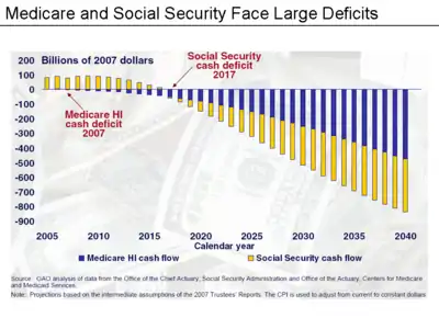 Since the federal government has historically collected about 18.4% of GDP in tax revenues, this means these three mandatory programs may absorb all federal revenues sometime around 2050.[18] Unless these long-term fiscal imbalances are addressed by reforms to these programs, raising taxes or drastic cuts in discretionary programs, the federal government will at some point be unable to pay its obligations without significant risk to the value of the dollar (inflation).[19][20]