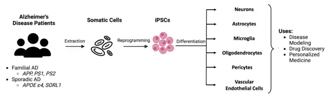 Patient-derived induced pluripotent stem cell (iPSC) lines are unique in which differentiated somatic cells are taken from Alzheimer's disease patients and reverted into pluripotent stem cells via an ectopic transcriptional "Tamanaka" factor cocktail.[11] These stem cells can then be directed to differentiate into many cell types, including neurons, astrocytes, microglia, oligodendrocytes, pericytes, and endothelial cells.[5][11] This allows these models to be generated from both early-onset familial Alzheimer's disease (FAD) patients with mutations in APP, PSEN1, or PSEN2 genes as well as late-onset/sporadic Alzheimer's disease (SAD) patients, a population which is not wholly replicated in animal models. As SAD is the most commonly diagnosed form of AD, this highlights iPSCs as key tools for understanding this form of the disease.[5] These cells can also be purchased commercially.[15][16] CRISPR-Cas9 technology can be used alongside iPSC cells to generate neurons carrying multiple FAD mutations.[5][10] One major downfall of these models are that they can inadequately resemble mature neurons as well as being more expensive and difficult to maintain.[11] iPSCs have also been shown to exhibit genomic instability and develop additional mutations when passaged (harvested and reseeded into daughter cultures) numerous times, posing both safety concerns for patient use as well as potential reproducibility problems in experimental studies.[5] Due to the nature of reprogramming procedures, iPSC cells lose cellular and epigenetic signatures acquired by aging and environmental factors, limiting iPSCs ability to recapitulate diseases associated with aging, like Alzheimer's disease. While these cultures have some limitations, many fundamental discoveries about Alzheimer's disease biology have been elucidated using this model system.