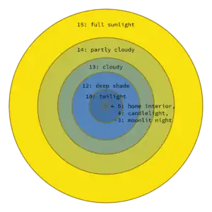 - ↑ Exposure values in Table 2 are taken from ANSI exposure guides PH2.7-1973 and PH2.7-1986; where the two guides differ, ranges of values have been given or extended. The ANSI guides were derived from studies by Loyd A. Jones and H.R. Condit, described in Jones and Condit (1941), Jones and Condit (1948), and Jones and Condit (1949).