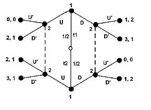 The game on the right is the same as the above game except that player 2 does not know what player 1 does when they come to play. The first game described has perfect information; the game on the right does not. If both players are rational and both know that both players are rational and everything that is known by any player is known to be known by every player (i.e. player 1 knows player 2 knows that player 1 is rational and player 2 knows this, etc. ad infinitum), play in the first game will be as follows: player 1 knows that if they play U, player 2 will play D' (because for player 2 a payoff of 1 is preferable to a payoff of 0) and so player 1 will receive 2. However, if player 1 plays D, player 2 will play U' (because to player 2 a payoff of 2 is better than a payoff of 1) and player 1 will receive 1. Hence, in the first game, the equilibrium will be (U, D' ) because player 1 prefers to receive 2 to 1 and so will play U and so player 2 will play D' .